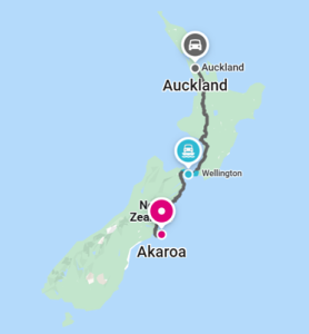 Akaroa location and journey from Auckland (Google Maps screenshot).